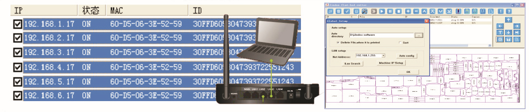 ⑥1. A PC computer controls multiple inkjet cutters through a router;2. The world's first super terminal cutting & drawing software, the terminal computer can preview and edit each queued file in the host computer;3. The host cutting and inkjet software communicates with the terminal software in real time, and it is not necessary to walk around between the computers when checking and editing the files in the inkjet cutting!