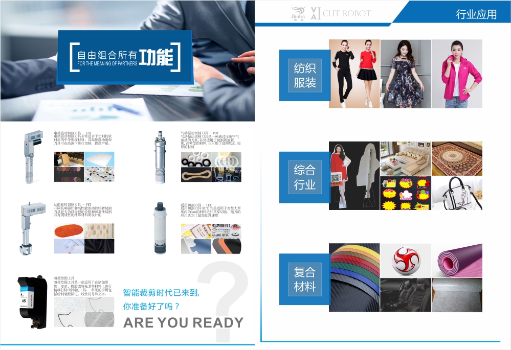 All kinds of apparel fabrics, car seat, furniture sofa, shoe bags and other industries widely print marking, cutting and circular feed CCD after correction for the integration of intelligent high-end jet cutting robot, usually with two roll of paper, rolls of material, the other a roll of paper roll