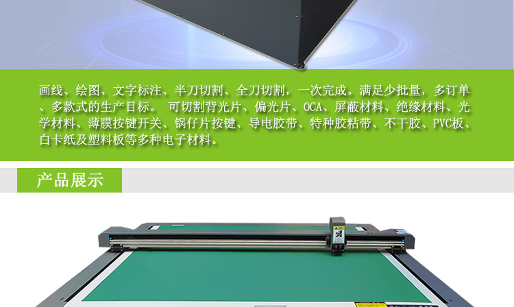 Line drawing, drawing, text annotation, half knife cutting, full knife cutting, a complete. Meet the production target of less batch, more orders and more styles. A variety of electronic materials are cuttable such as backlight, polarizer, OCA, shielding material, insulating material, optical materi