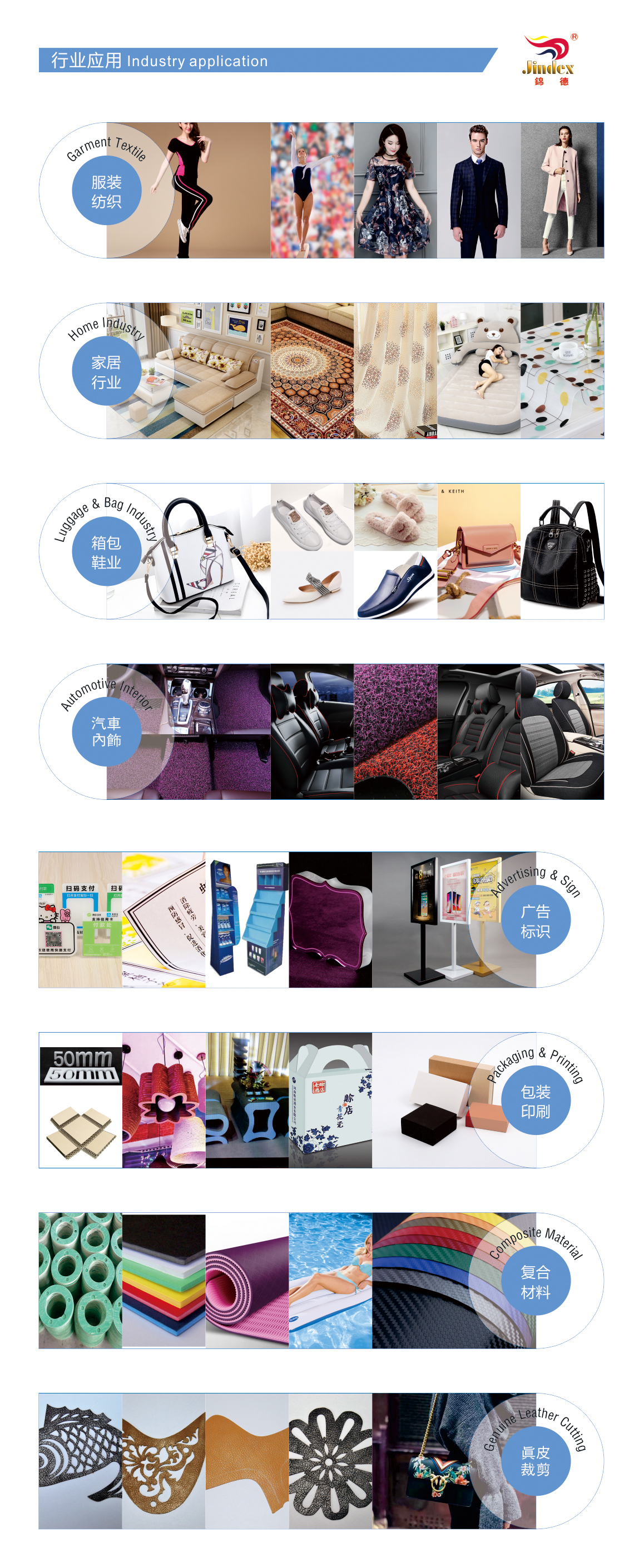 All kinds of apparel fabrics, car seat, furniture sofa, shoe bags and other industries widely print marking, cutting and circular feed CCD after correction for the integration of intelligent high-end jet cutting robot, usually with two roll of paper, one for paper, one for material. Punching and cutting automatically after inkjet printing, automatically feeding material after cutting.